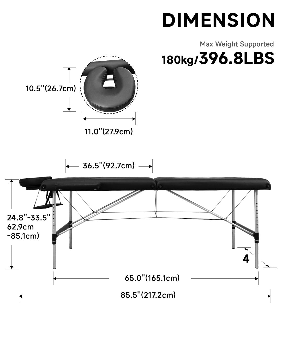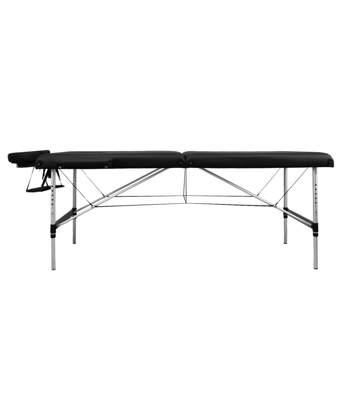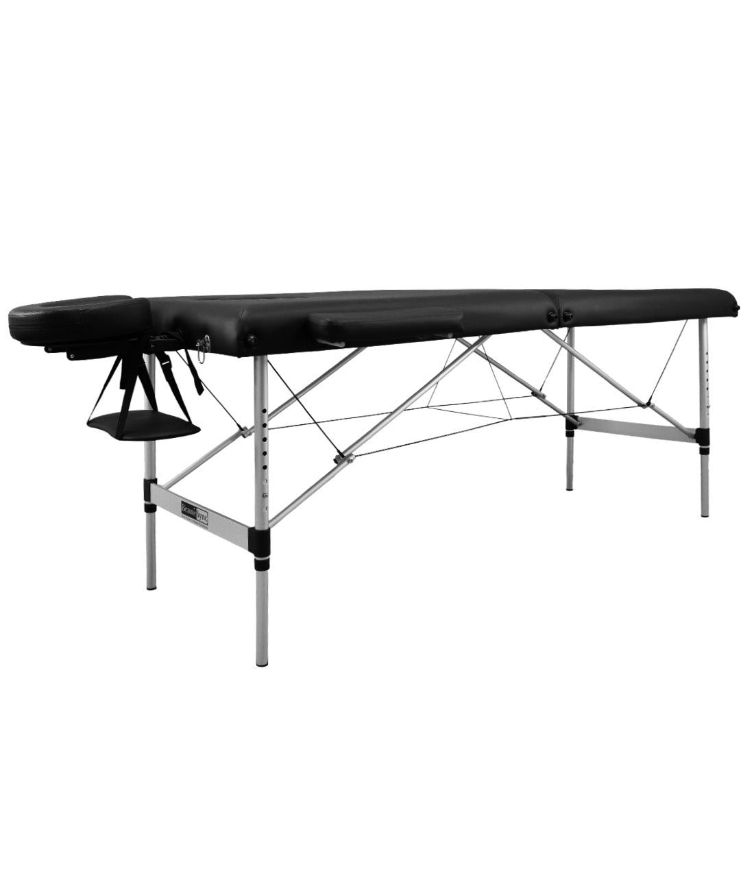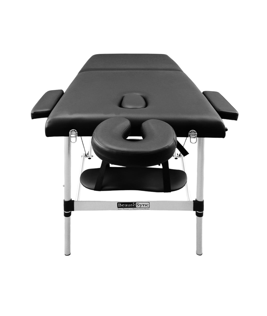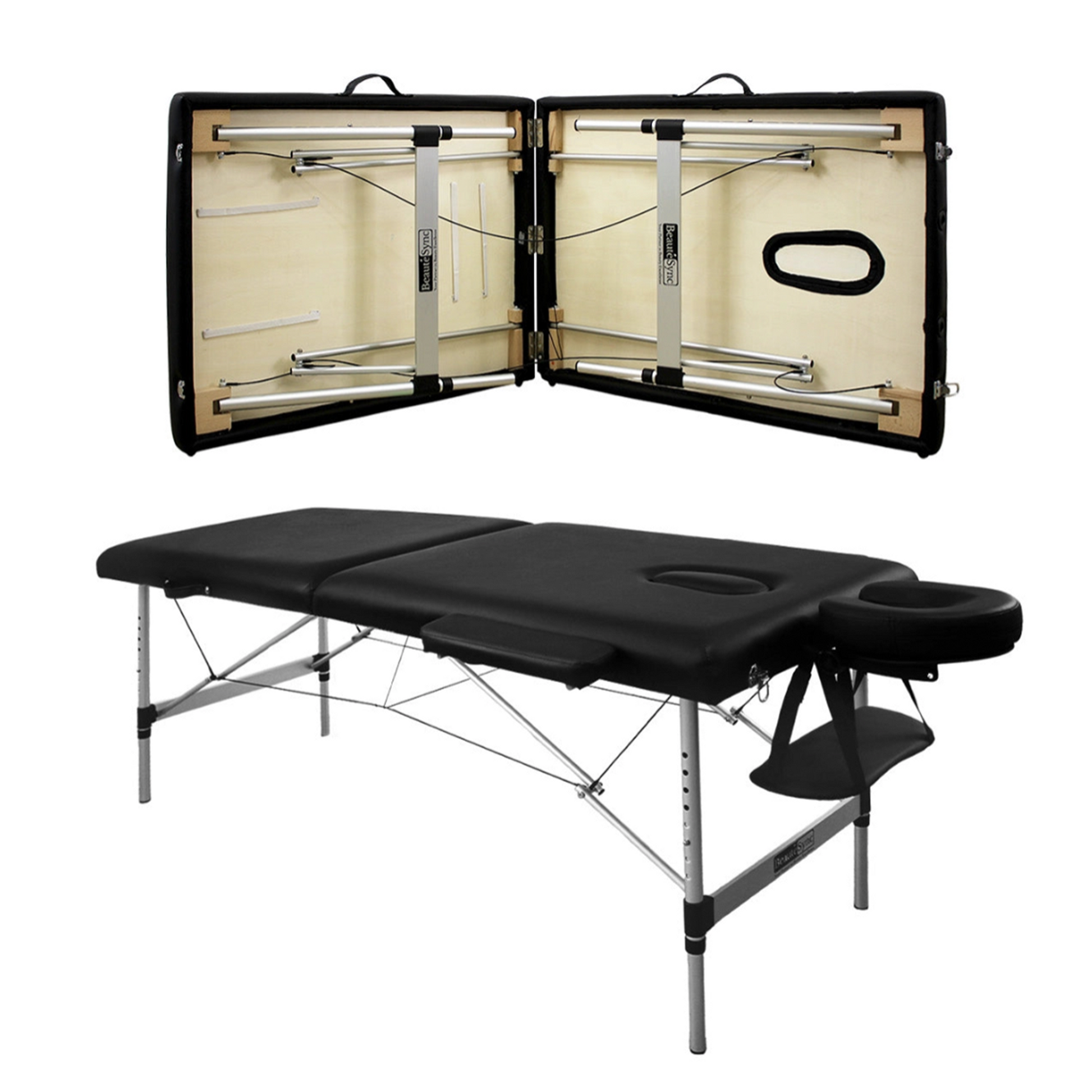 BeautéSync® 2-Fold Portable Aluminum Massage Table – 73"x28", Black PVC Leather, with Armrests, Headrest, Sling, Pillow & Carry Bag