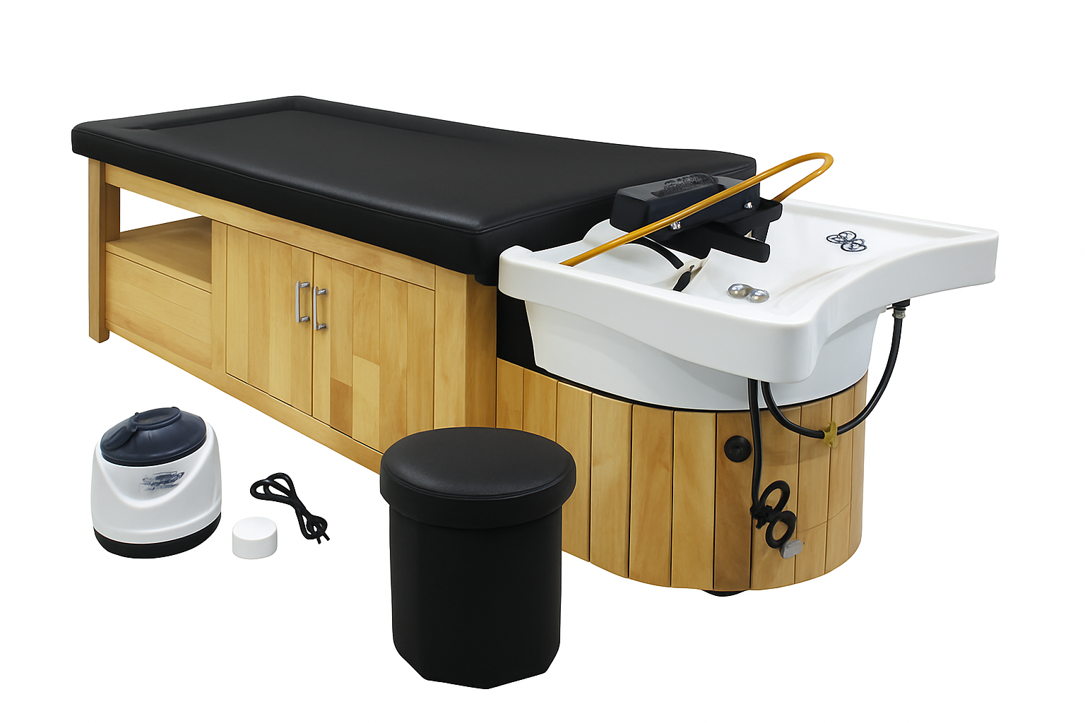 Built with a solid wood base, this bed offers both style and stability, while the ergonomic cushioning and waterproof leather ensure maximum client comfort. It comes fully equipped with a technician stool and all essential accessories—ready for premium scalp detox, deep conditioning, and foot soak services.